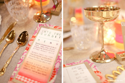To be more eye-catching you can also place a colourful napkin between two neutral plates, or you can even choose one plate different from all the others. The food itself can be a “decorative weapon”, you just have to be creative. Also the menus, the napkin rings and the little souvenirs on each guest’s plate, will certainly leave a mark.
