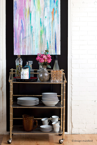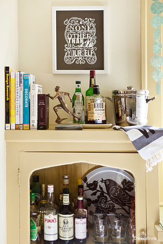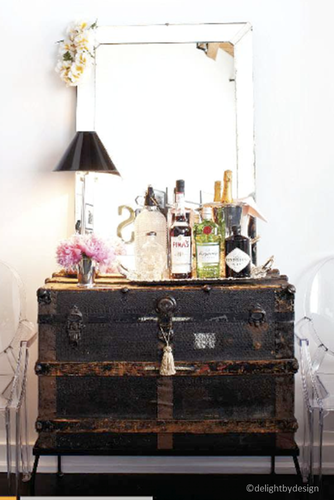 If you entertain frequently a proper bar is a must! The proposal we bring you today is to create a bar area, incorporating it into your living room. You may choose to use bar carts or at-home bars using a console or even a shelf. For a good display, combine the proper glasses and bottles with small personal trinkets on a glass or mirrow top. Add natural flowers or a touch of color to keep it fresh and elegant.